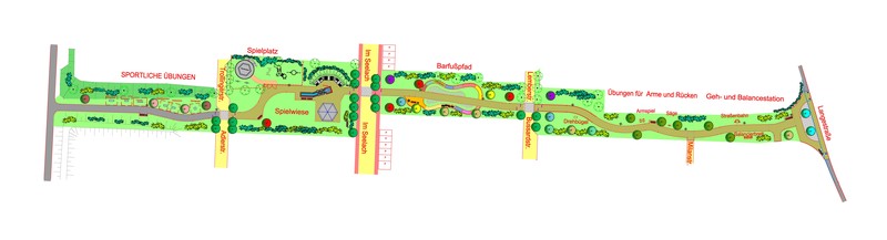 Zwischen der “Lembergerstraße” / “Bussard-straße” und der Straße “Im Seelach” ist der Barfußpfad angelegt. Auf insgesamt 13 Feldern können alle Neugierigen austesten, wie es sich auf Holz, Stein und sogar Muscheln laufen lässt. Ein Wasseranschluss an der Bank sorgt dafür, dass man sich danach die Füße waschen kann. Zwischen der Langestraße und der “Lemberger-straße” / “Bussardstraße” sind fünf Stationen eingerichtet, an denen nicht nur - aber auch Senioren Bewegungen und Balancegefühl testen und trainieren können. Übungen für Arme und Rücken runden das Angebot ab.